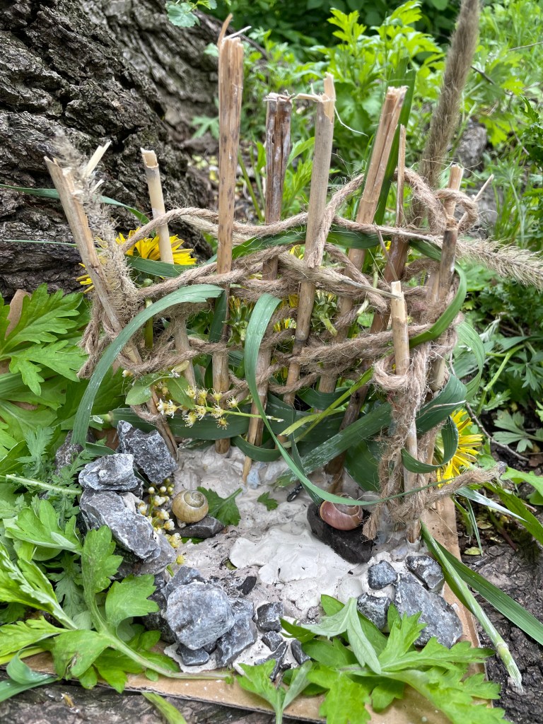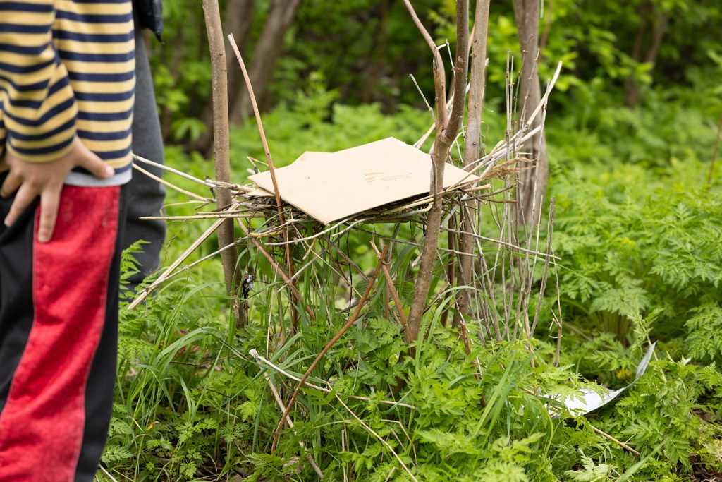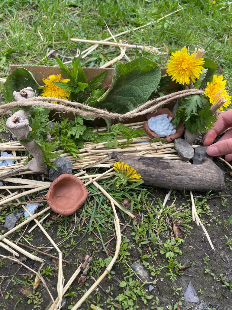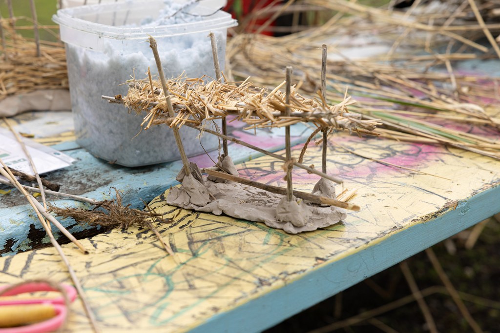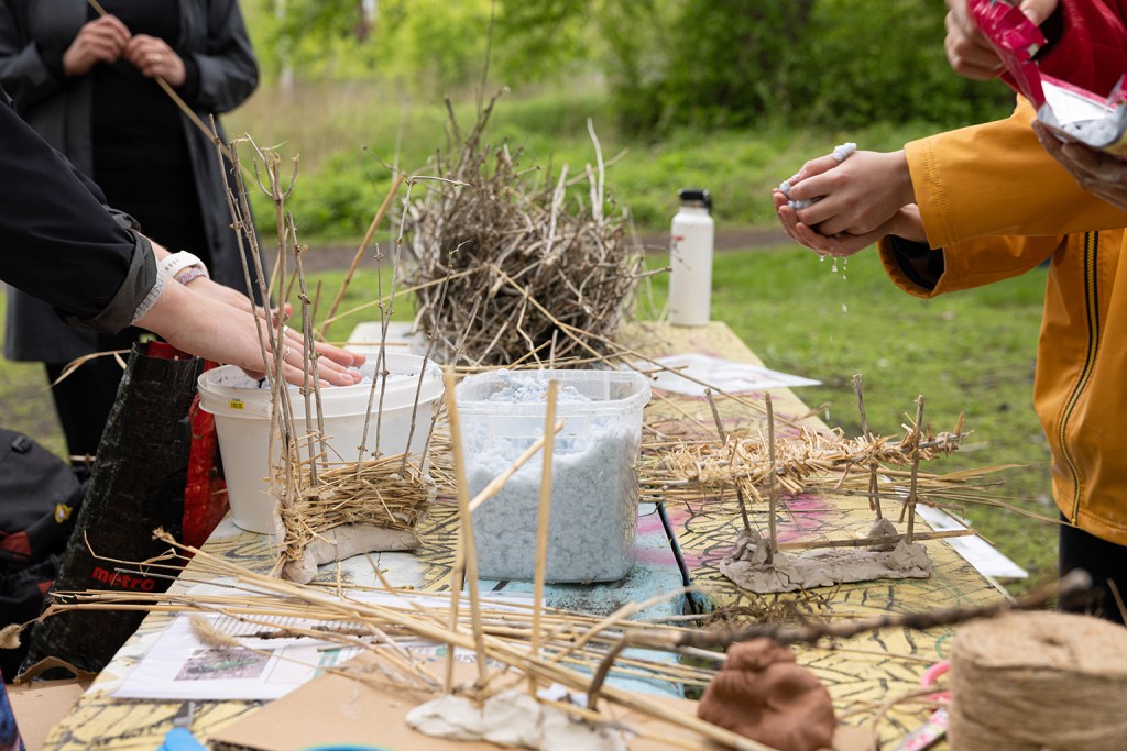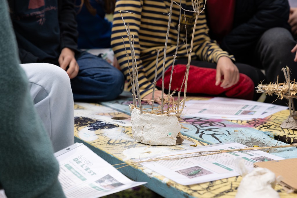 Our workshop with the grade 3-4 students took place in the nearby Champ des Possibles, a neighborhood project of commons-making, and wild meeting ground of great importance for Leisure as well as Spoonful. Provisioned with long grass, airdry clay, cotton pulp and twine, the students followed a short “wattle and daub” demonstration, and then fabricated habitat amendments for local species at risk, installing them in tree branches and furrows of the champ.