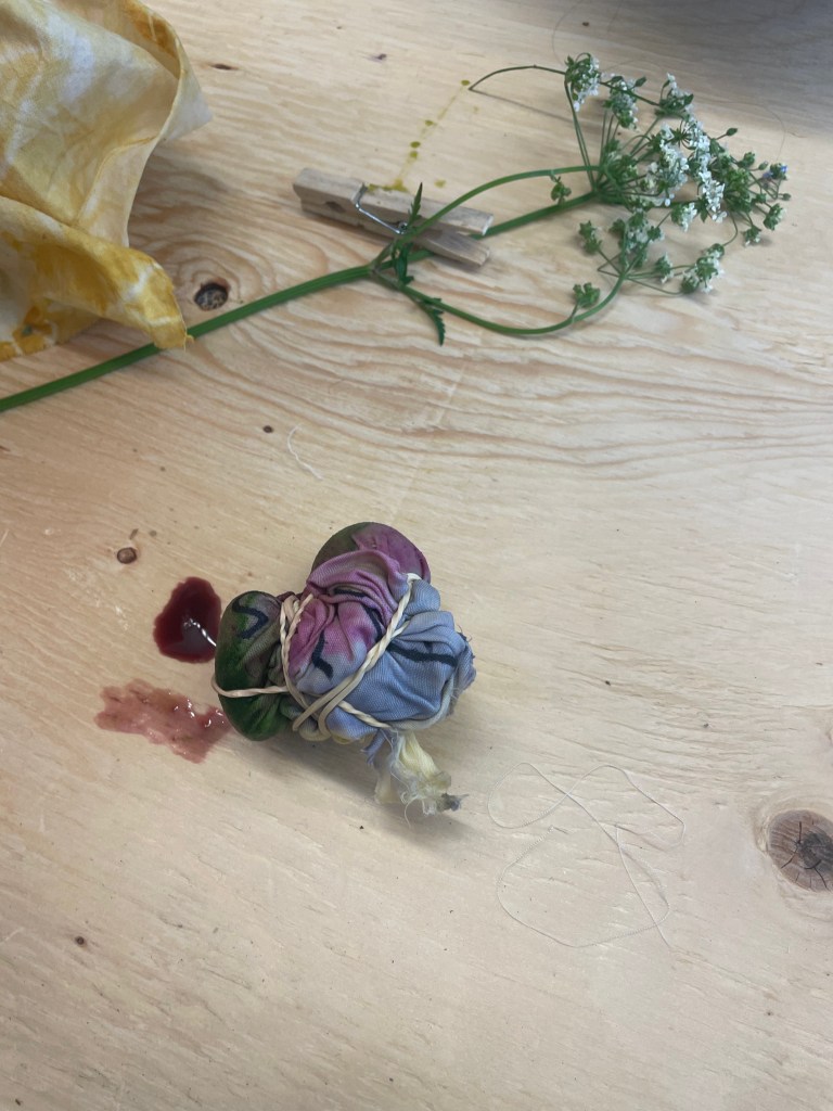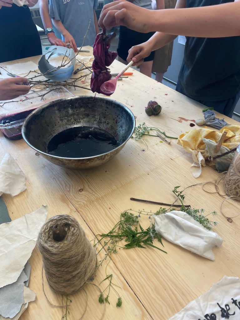 After that, Andrea took them into another room in the gallery where large tables were set up and she showed them some plant-made dyes of bright colours and how to fold and bind pieces of fabric to allow for interesting dye patterns. The students then copied their animal stories onto the fabric and had lots of fun experimenting with the colour combinations and effects of the plant dyes mixing.