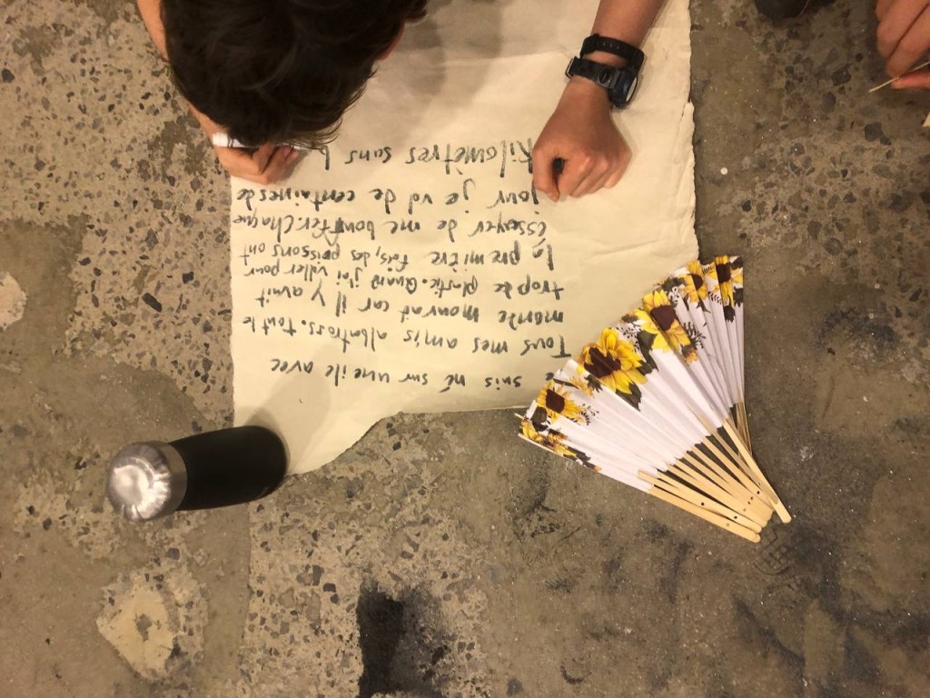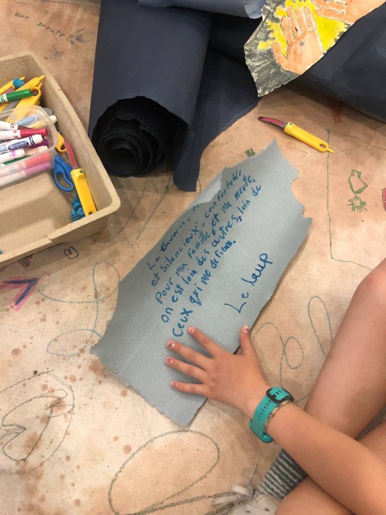 Our second school workshop, invited by Leisure and hosted by Galerie Optica, was held on a smoky day last June. In fact, on this day, Montreal had the world record for poorest air quality We had planned to again hold the workshop in the wonderful beautiful Champ des Possibles, but decided to stay indoors, as exposure to air pollution is dangerous. Nina took this event as an opportunity to discuss wildfires and forest custodianship by First Nations with the children, and gave them a space to express their feelings related to climate change and intense weather events.
